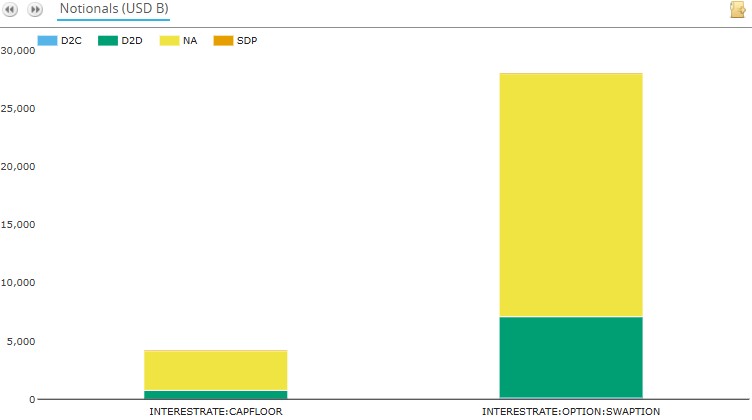 Chart 1: SDR-reported volumes of swaptions, caps and floors in all currencies by product and platform type (notional USD millions). Source: SDRView