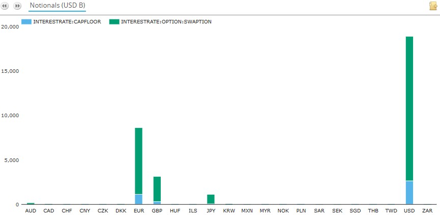 Chart 2: SDR-reported volumes of swaptions, caps, and floors by currency (notional USD millions). Source: SDRView