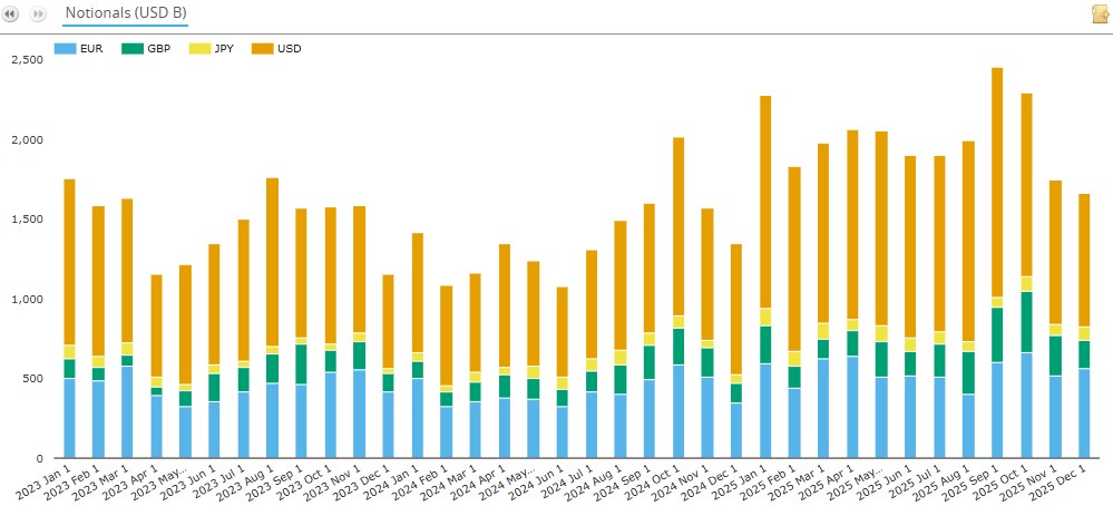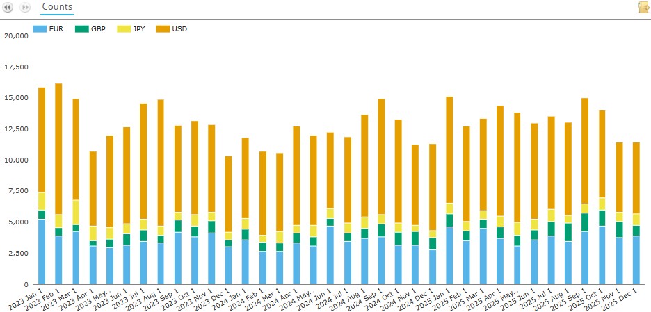 - 2025 saw the highest ever full-year SDR-reported notional volumes – up 35 percent from 2023, while full-year trade counts were flat versus 2023.