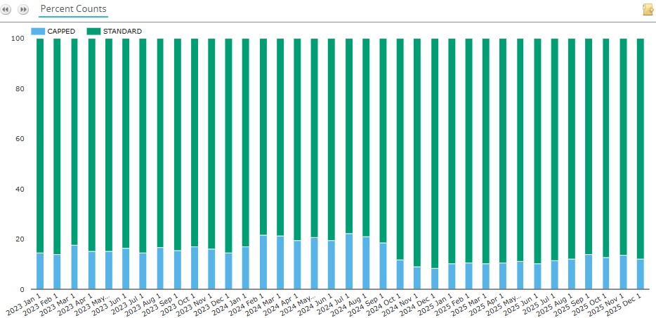 Chart 5 shows the reduction in the capped share of trade counts from October 2024 onwards. As a percentage of total trade count, full-year capped trades were 15.5 percent in 2023, 17.5 percent in 2024, and 11.4 percent in 2025.