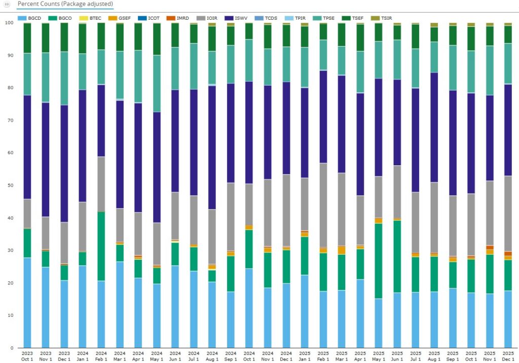 We also use package-adjusted trade counts. These eliminate the multiple-counting of trades for multi-legged packages. They also avoid the effect of reporting cap increases in late 2024 in metrics based on notional and DV01.