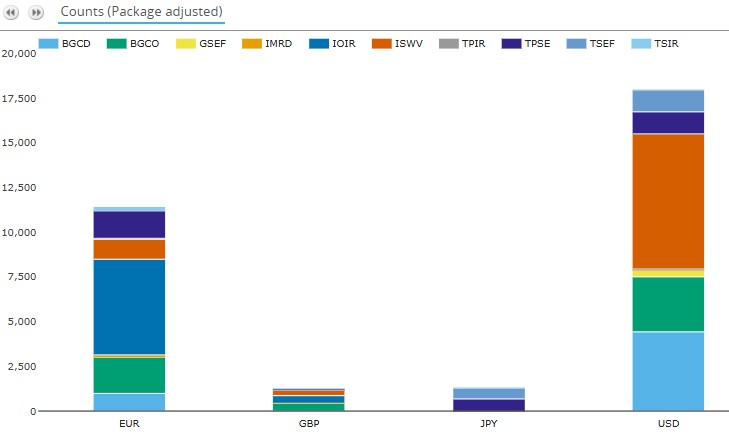 Chart 4: SDR-reported G4 swaptions activity by major currency (trade count). Source: SDRView
