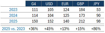 - JPY completed the G4 picture with $982 billion – up 25 percent on 2024, and up 58 percent on 2023.