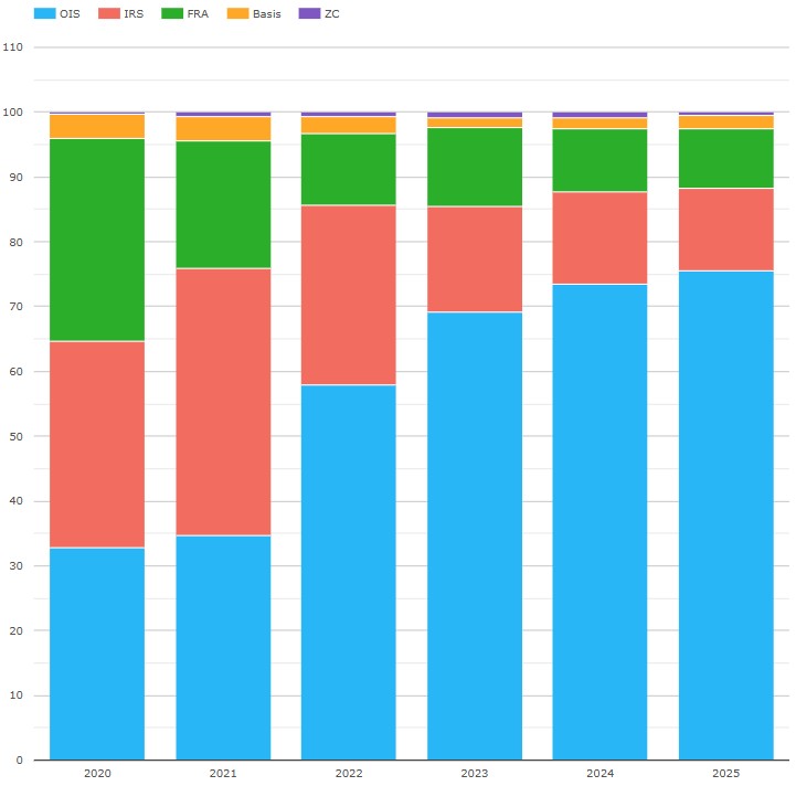 - SOR and SIBOR cessation for SGD on 30 June 2023 led to $3.45 trillion of SORA OIS in 2025 — up 1,896x from $1.82 billion in 2020.
