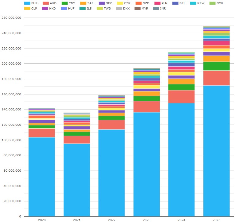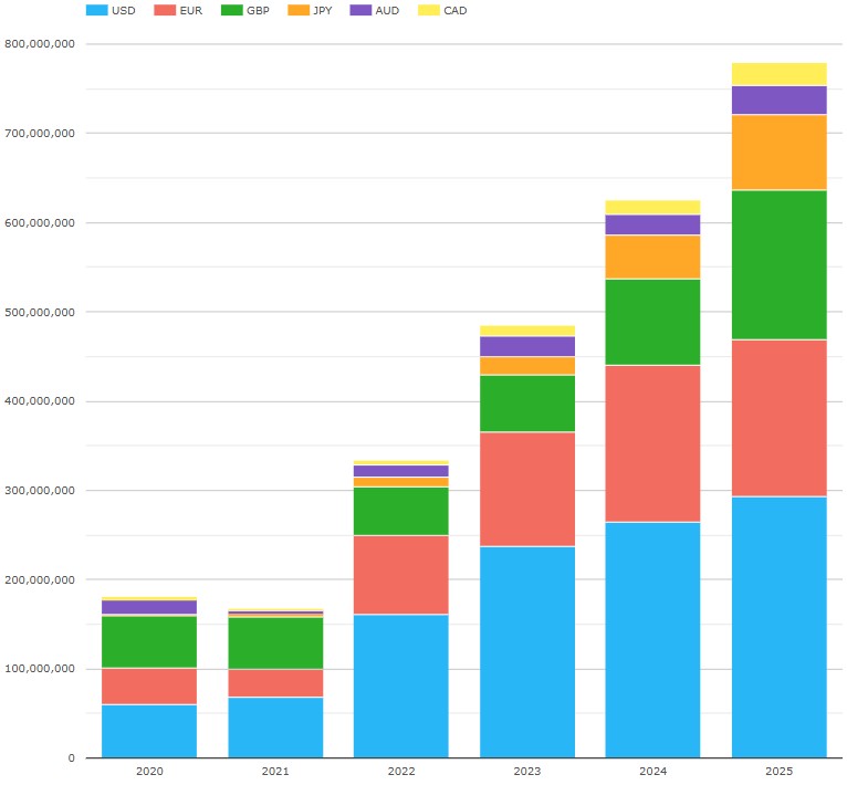 - EUR had $171 trillion in 2025 (comprising Euribor IRS, FRAs, and Euribor versus €STR basis swaps).