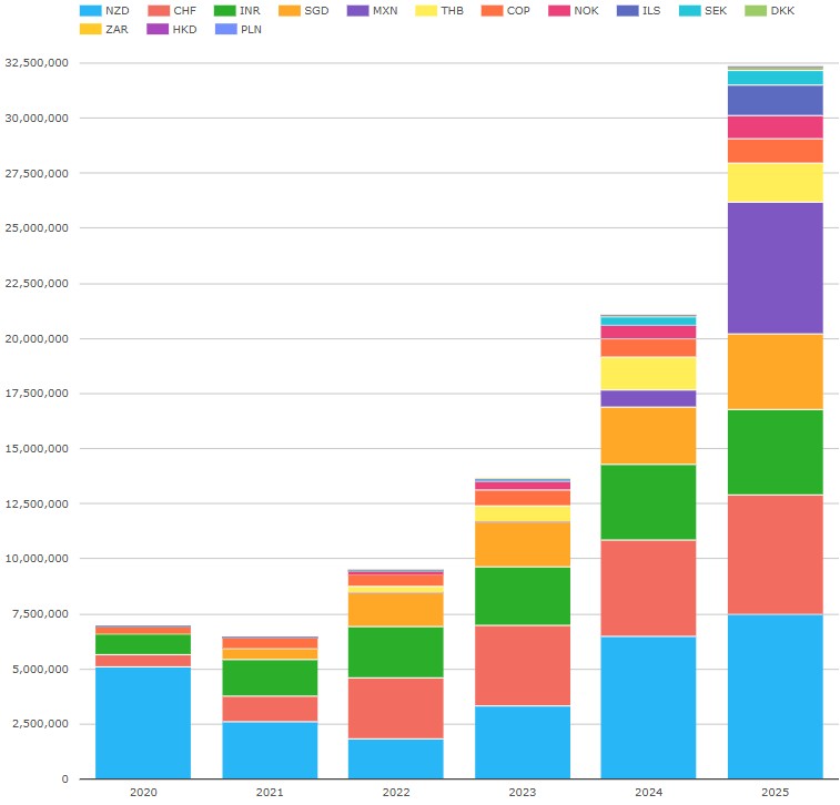 Three other currencies – ZAR, PLN, and ILS – had $14.3 trillion in 2025 and have full RFR-transitions in progress.