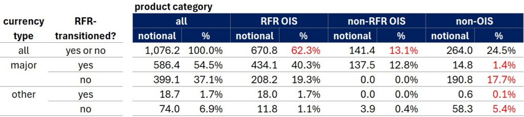 Table 1 shows that 62.3 percent are in RFR OIS (40.3 percent in transitioned major currencies and 19.3 percent in untransitioned major currencies). The remaining 37.7 percent breaks down as follows: