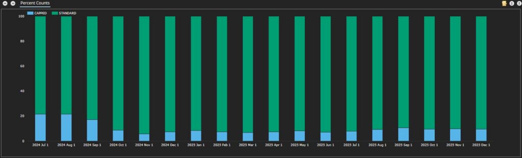 Let us take a quick look at USD swaptions’ capped trade percentages.
