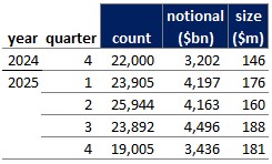 Table 1 shows that Q4 2025 trade sizes were $181 million – up 24 percent YoY, but down 4 percent QoQ. The YoY increase in notional volume is because the percentage increase in trade size was bigger than the percentage decrease in trade count. Take another look at Charts 3 and 4 to visualize the effect of trade size increases in 2025 for yourself.