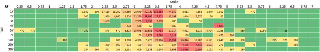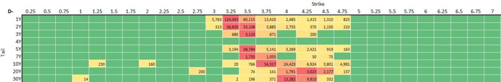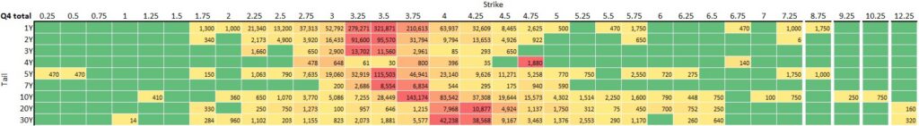 - The most active tail was 1Y. Within 1Y, the most active strike was 3.5 percent with 3.75 not far behind (3.75 and 4 percent stood out in Q3).