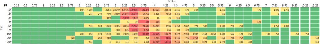 Table 4: USD payer swaptions notional volumes by major tail and strike in USD millions. Source: SDRView
