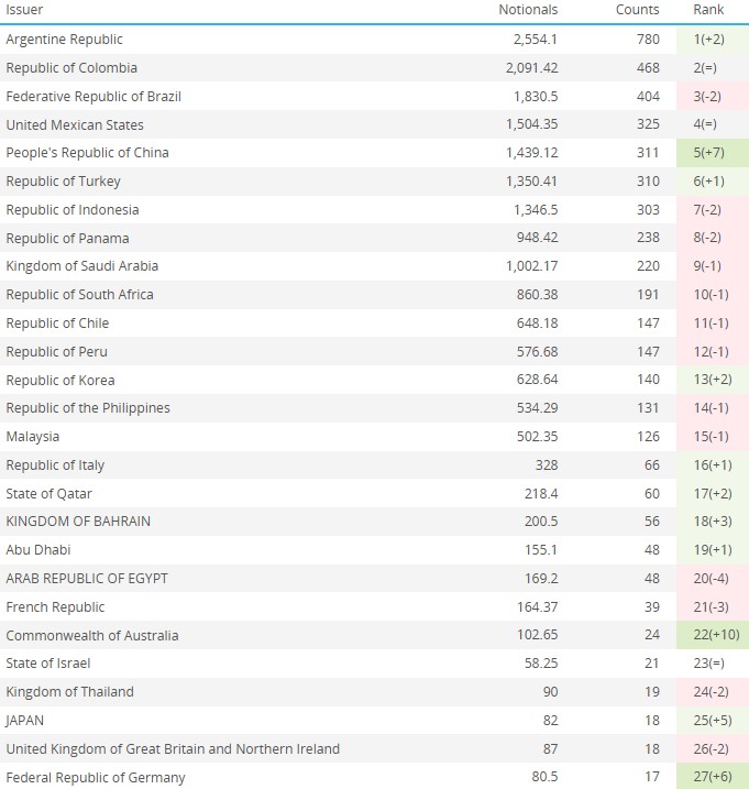 - Argentina was the most active name with 780 trades – up month-on-month (MoM) from third, and up half-on-half (HoH) from 16th in March.