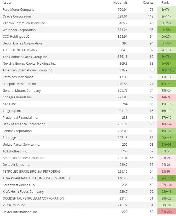 A higher rank due to an increase in trading, could arise from, for example, a change in investor perception of the credit-worthiness of a name, a recent debt issue, or some kind of financial news for the name or its sector.