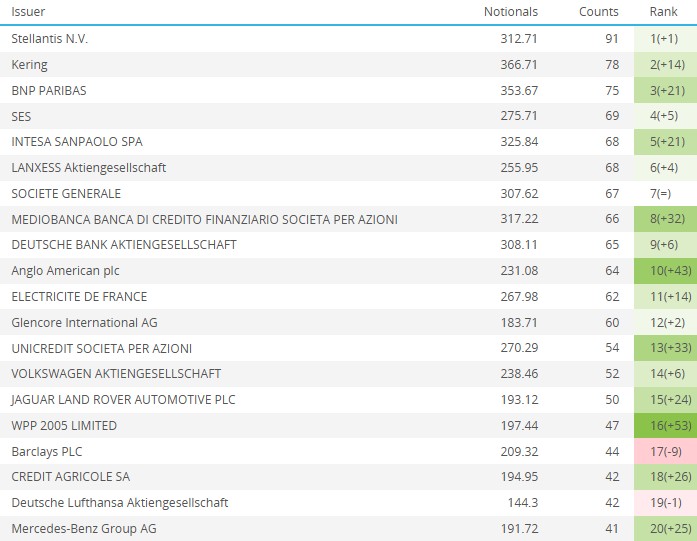 - Other notable MoM risers were Mediobanca (up 32 places), Anglo American (up 43 places), Unicredit (up 33 places), WPP 2005 (up 53 places), Credit Agricole (up 26 places), and Mercedes-Benz (up 25 places).