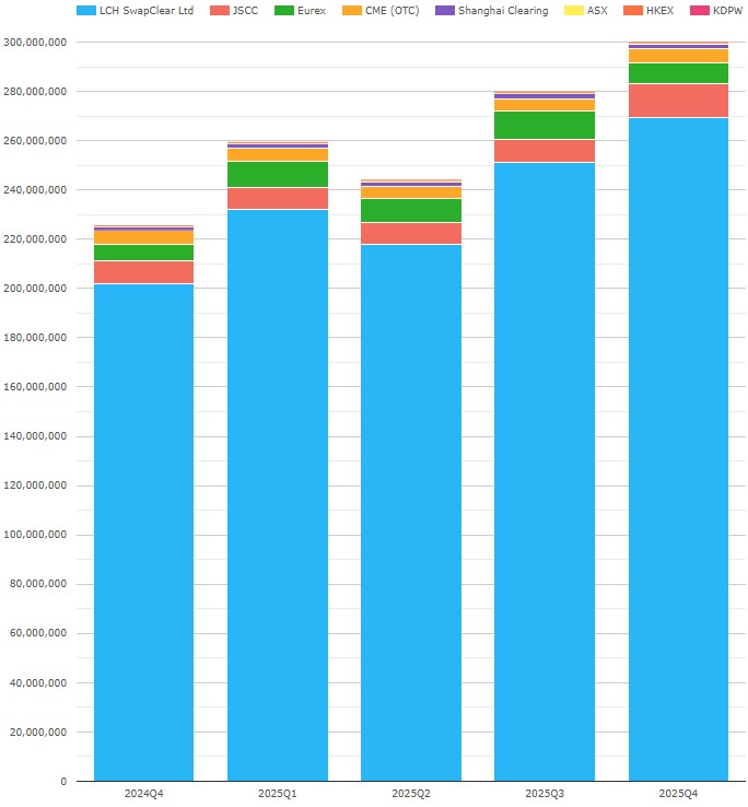 - LCH SwapClear reported $250 billion or £186 billion – in GBP terms, down 1.1 percent QoQ, and down 2.8 percent YoY from its high of £192 billion in Q4 2024.