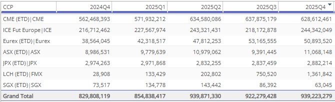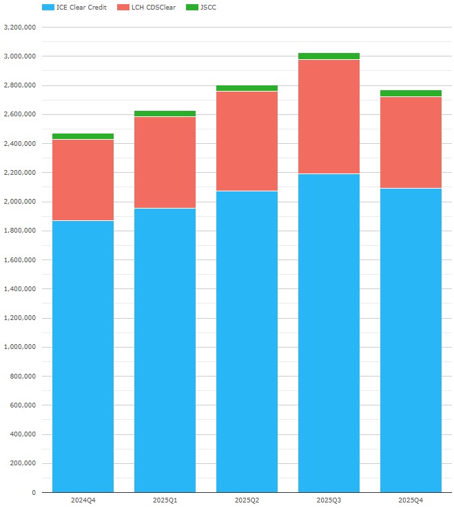 - LCH CDSClear reported $12.3 billion or €10.5 billion – in EUR terms, down 4.4 percent QoQ, but up 6.7 percent YoY. This is just below its peak of €11.1 billion in Q2 2025.